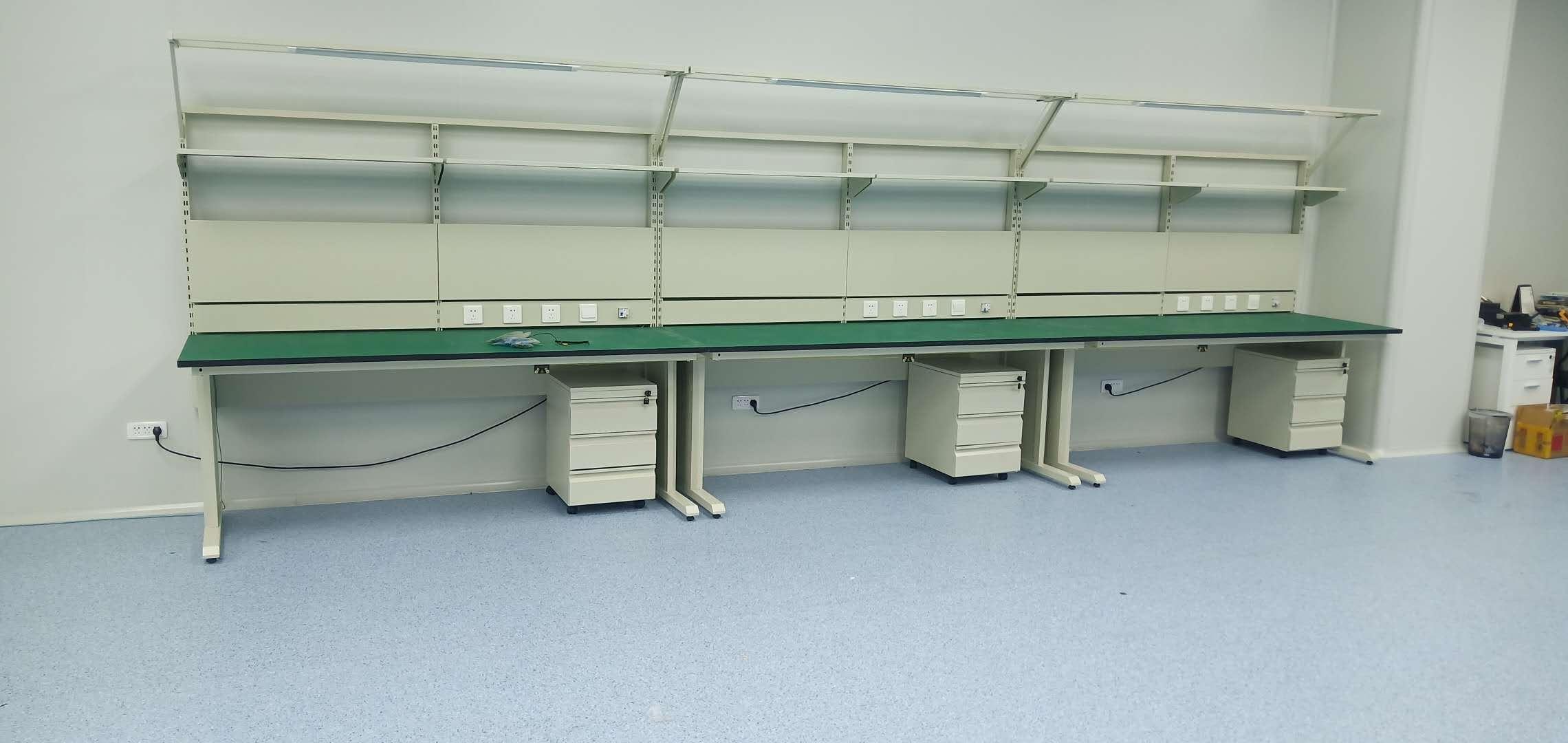 3、防静电桌面,基板为高密度木板,内铺铜箔导线以及炭黑,表面铺防静电胶皮,四周开槽黑色胶皮封边,使桌面具有防静电功效