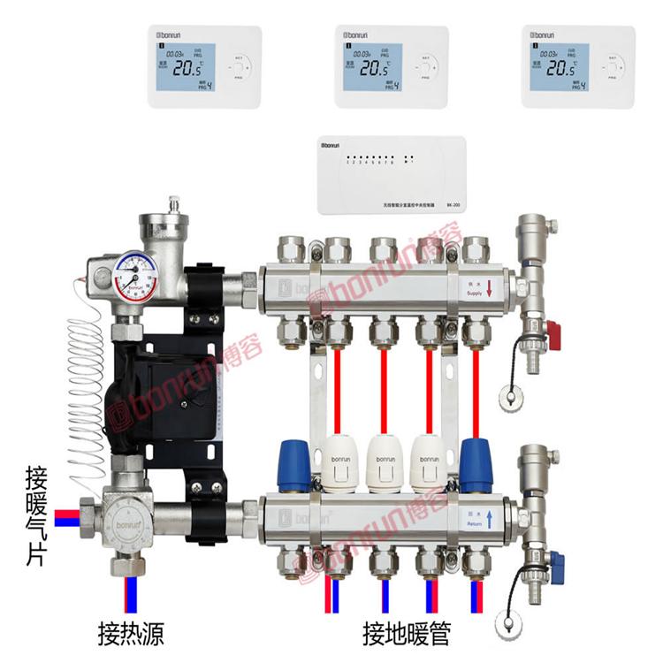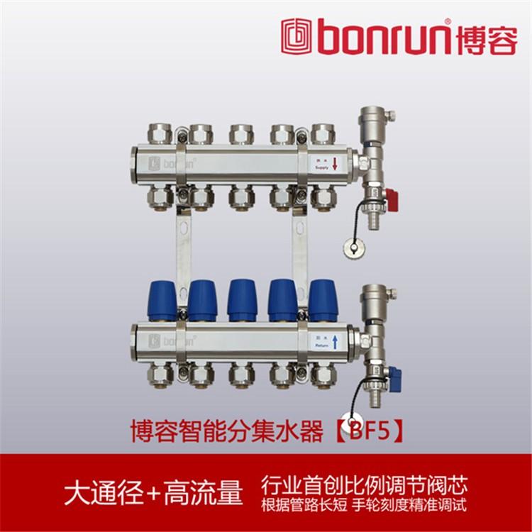 博容BF5智能地暖分水器是博容最新推出优质大口径分水器比例流量调节分水器,可升级为地暖分室温控系统。