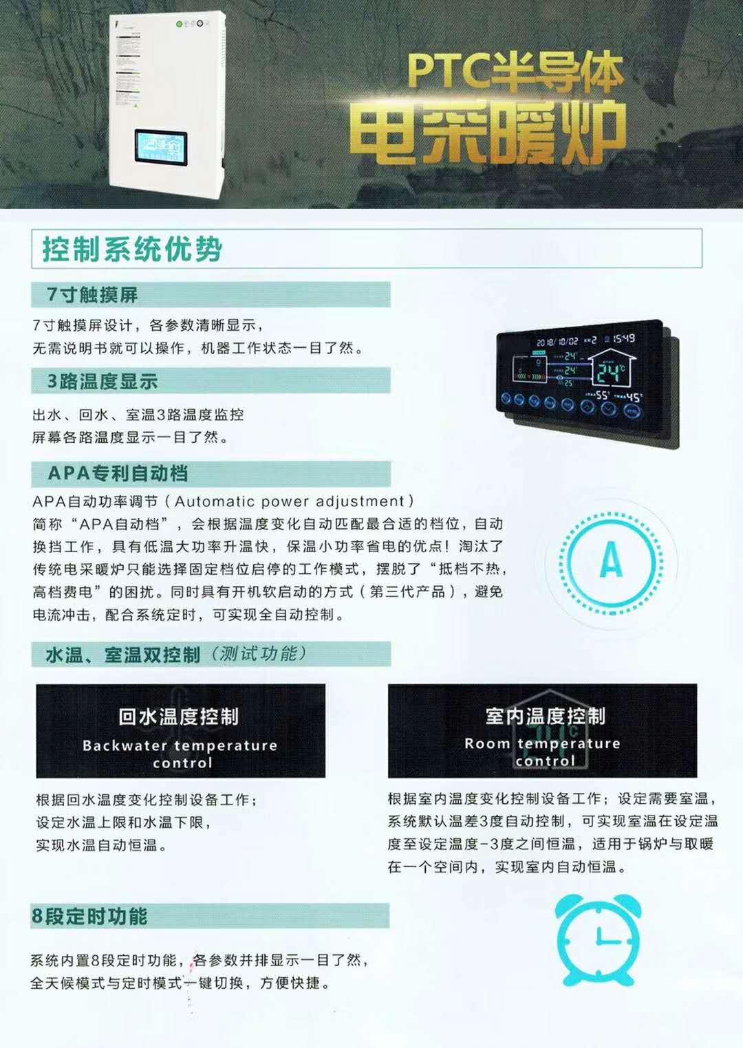 ●日计划模式:控制系统设计有六个加热时段,可分别对启停时间、运行温度进行设置,设备根据预设时间段进行定时、定温自动启停控制。