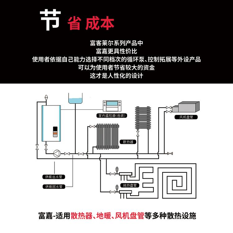 富嘉 是定向研发产品,课题源自社会主义新农村民居电供暖项目,三档功率手动硬件调节,交流接触器气动加热,预留2A水泵电源接口,数显电压电流表,水温控制电锅炉控制器,数字显示,自主研发生产,