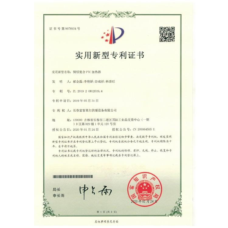 这款PTC电加热器热传导效率更高,我们已经获得实用新型技术专利和外观设计专利。(图1:实用新型专利)