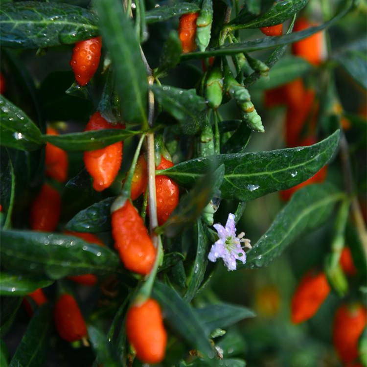 枸杞(是茄科、枸杞属多棘刺灌木,高可达150厘米,多分枝;坚硬,有不规则的纵条纹,小枝顶端渐尖成棘刺状,节间短缩,有簇生叶或花、叶同时簇生,在幼枝上则单叶互生,肥厚肉质,顶端钝圆,基部渐狭,中脉不明显,花生于短枝上;花梗细瘦,花萼狭钟状,花冠漏斗状,浅紫色,裂片矩圆状卵形,耳片不明显;花柱与雄蕊近等长。浆果紫黑色,球状,种子肾形,褐色,5-10月开花结果。