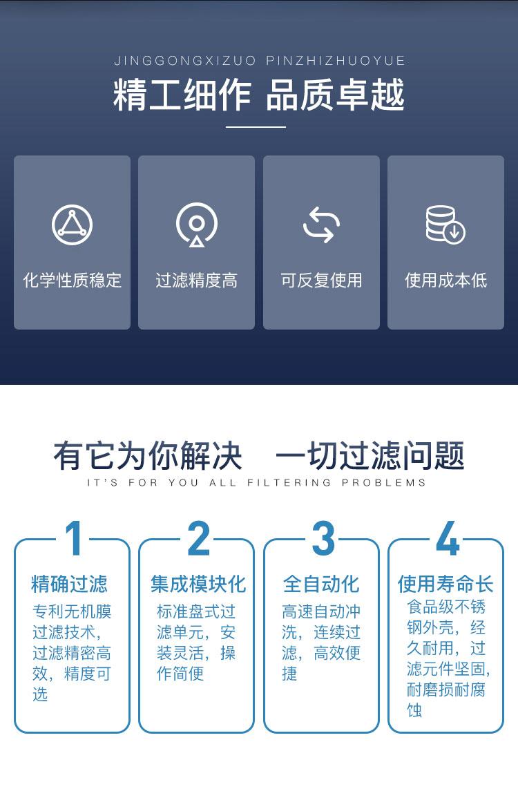 | 过滤精度 | 0.1~2微米 | 过滤流量 | 2~10000吨/小时 |