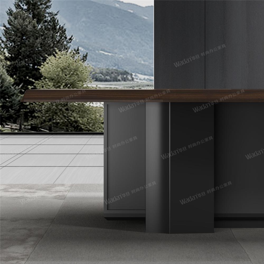 Ø 台面复合厚度50mm,采用斜切边工艺与扁铁脚架相结合尽显时尚轻奢的设计理念;在配色上深色胡桃木纹体现原木风情与咖灰金属漆的有机结合表现出办公高效简约的商务风格