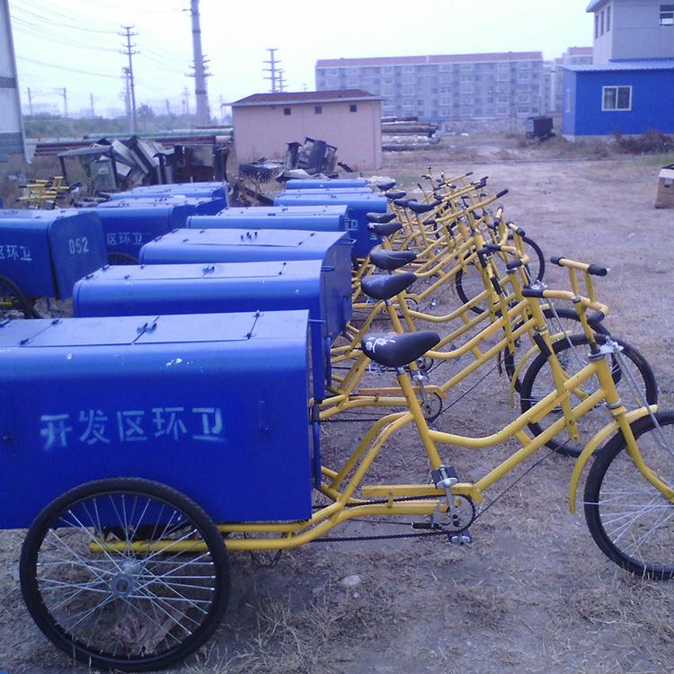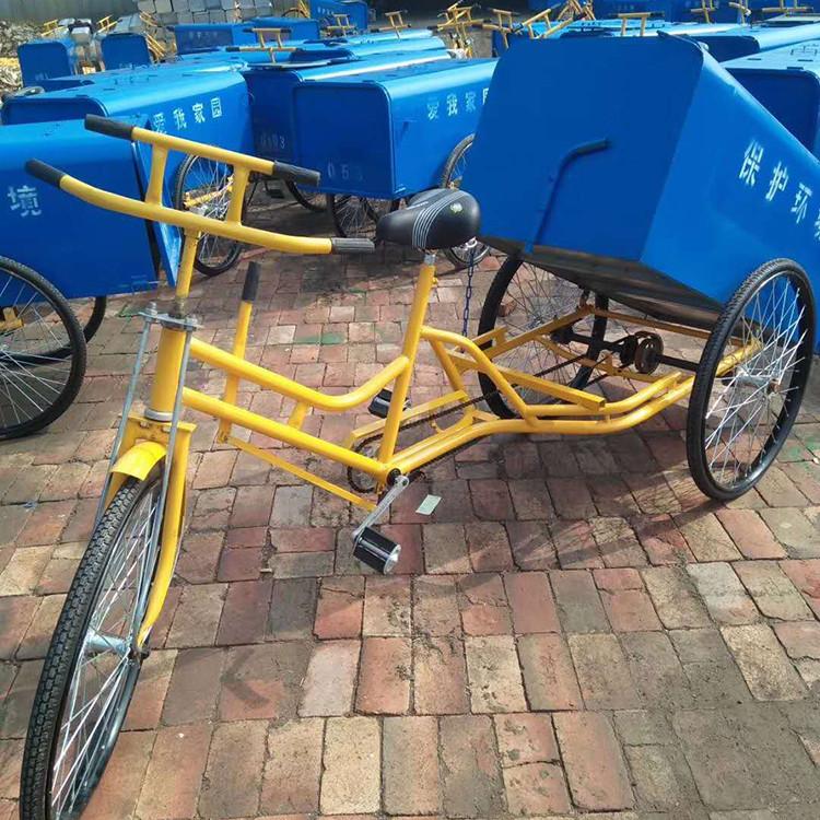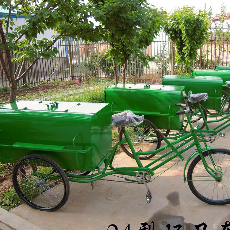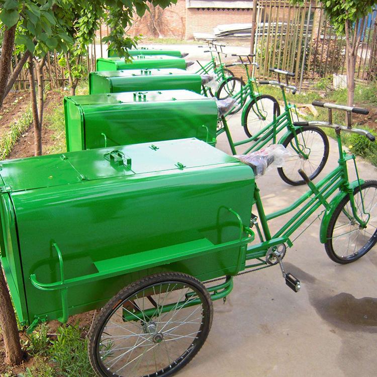 垃圾车箱体顶部设计有两个对开的上盖,便于收集投放垃圾。箱体的后盖在倾倒垃圾时可掀开,摘掉车箱前面与车架的挂勾,轻轻一抬,垃圾便可实现自卸,非常方便。