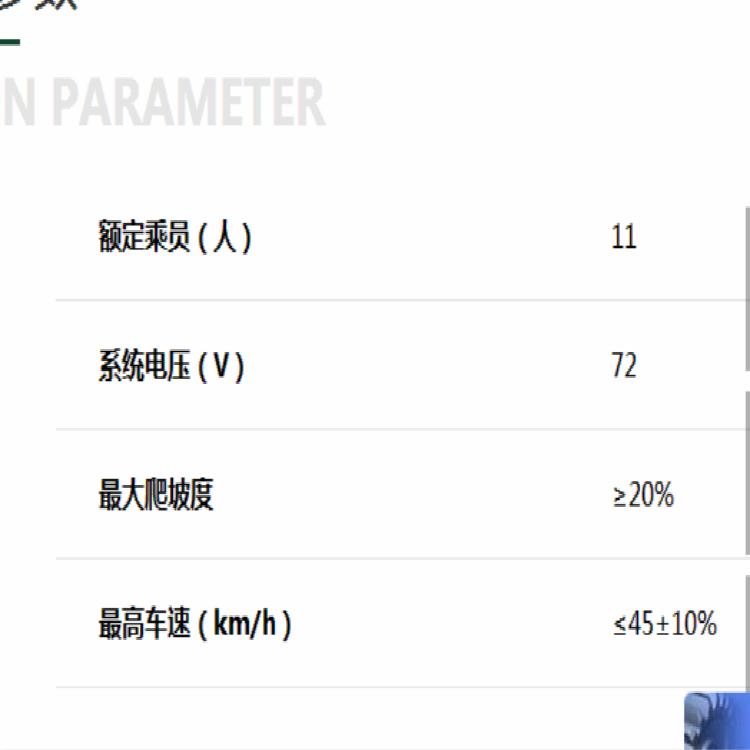 | 续航里程(km) | ≥100 | 额定乘员(人) | 11 |