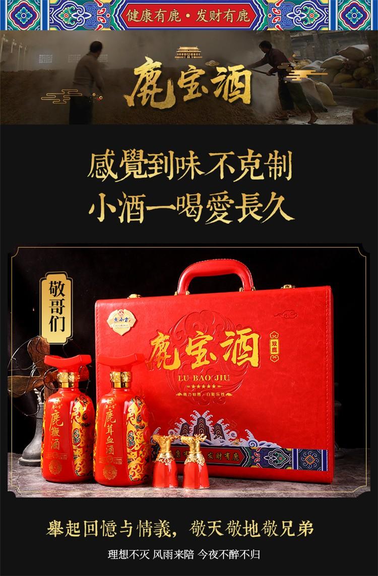 | 酒精度 | 42%voL | 净含量 | 鹿鞭酒 鹿茸血酒 随机500ml * 2瓶 酒杯*2只 |