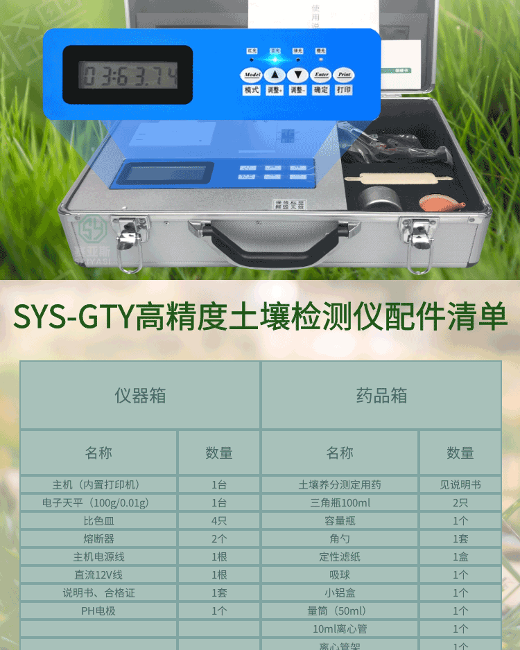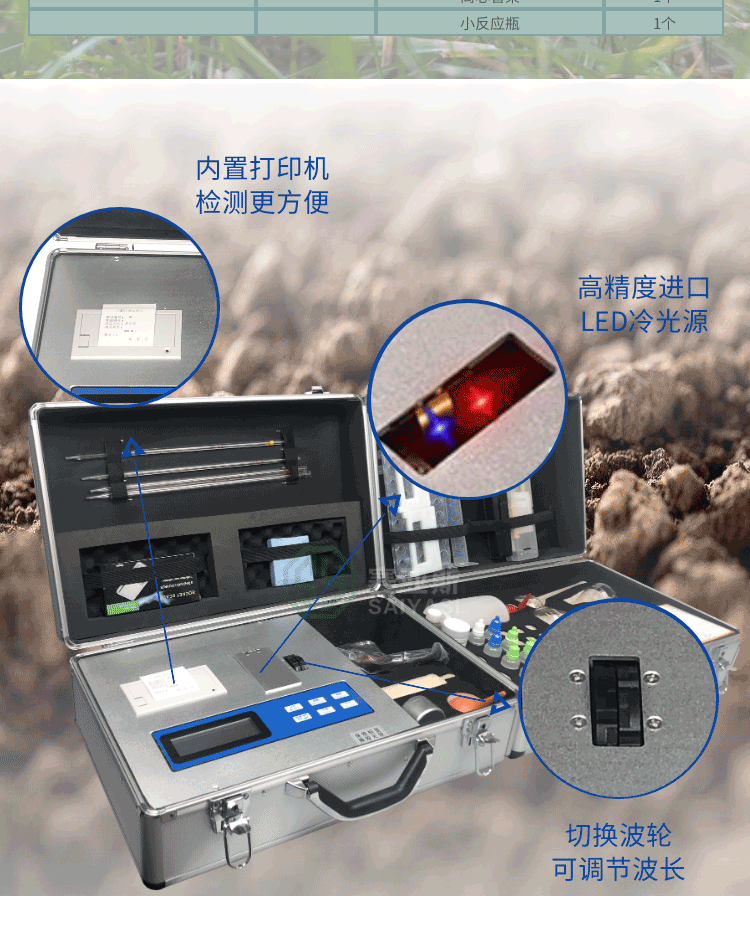 配套齐全:该仪器集药、器、仪为一体,携带方便,相当于一个小型实验室。适于农业服务部门或农资经销商、肥料厂商测土施肥和鉴别肥料真假。