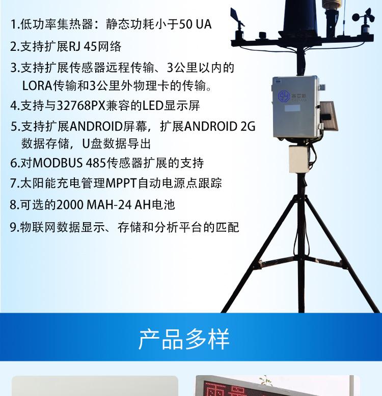 气象环境监测设备是专为当地小规模农田和草地环境设计的,农田小气候站与土壤、水、气等植被和农作物的生长及其他环境参数密切相关,主要观察与农业有关的9个气象因子,如气温、空气湿度、光强、二氧化碳浓度、光合有效辐射、土壤温湿度、风速、风向等,为农业科研和农业生产提供良好的支持。
