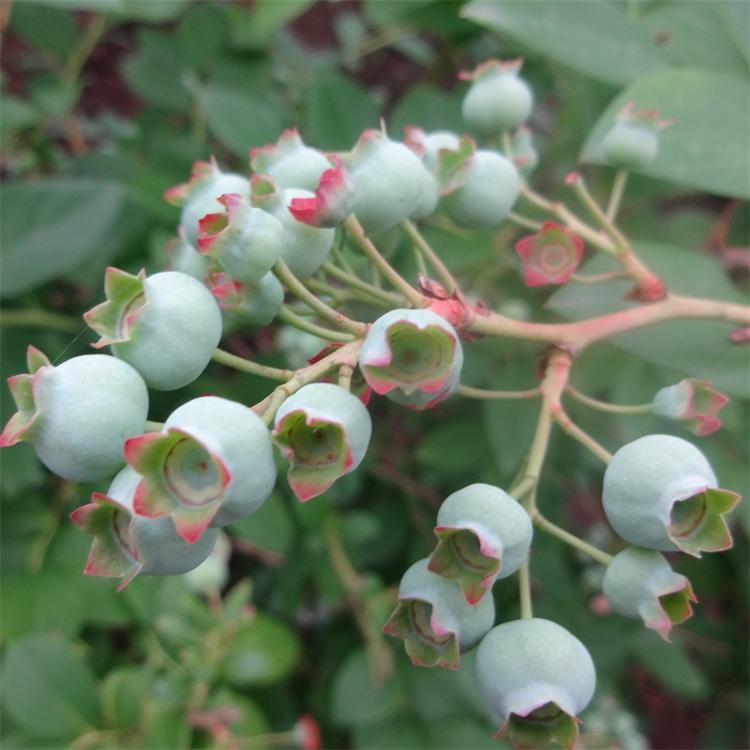 蓝莓果实大小、颜色因种类而异。多数品种成熟时果实呈深蓝色或紫罗兰色,如兔眼蓝莓、高丛蓝莓和矮丛蓝莓等,少数品种为红色。果实有球形、椭圆形、扁圆形或梨形,平均单果重0.5~2.5g,直径0.8~1.5cm不等,兔眼蓝莓的单果重最大可达到25g。蓝莓果实一般在花后70~90天成熟。果肉细软,多浆汁。种子细小,食用时可随果肉食下而不影响口感。