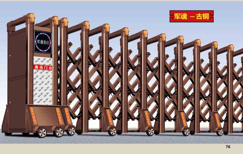 6)、独特的工艺制作:门体主框型材由异型管压槽而成,独特设计成扣合结构中轴连接,这是运行结构上的革命性创新,手工精抛,在连接结构上完全舍弃塑料连接件,无一处焊接,大大延长了伸缩门的寿命,真正体现出白金品质。