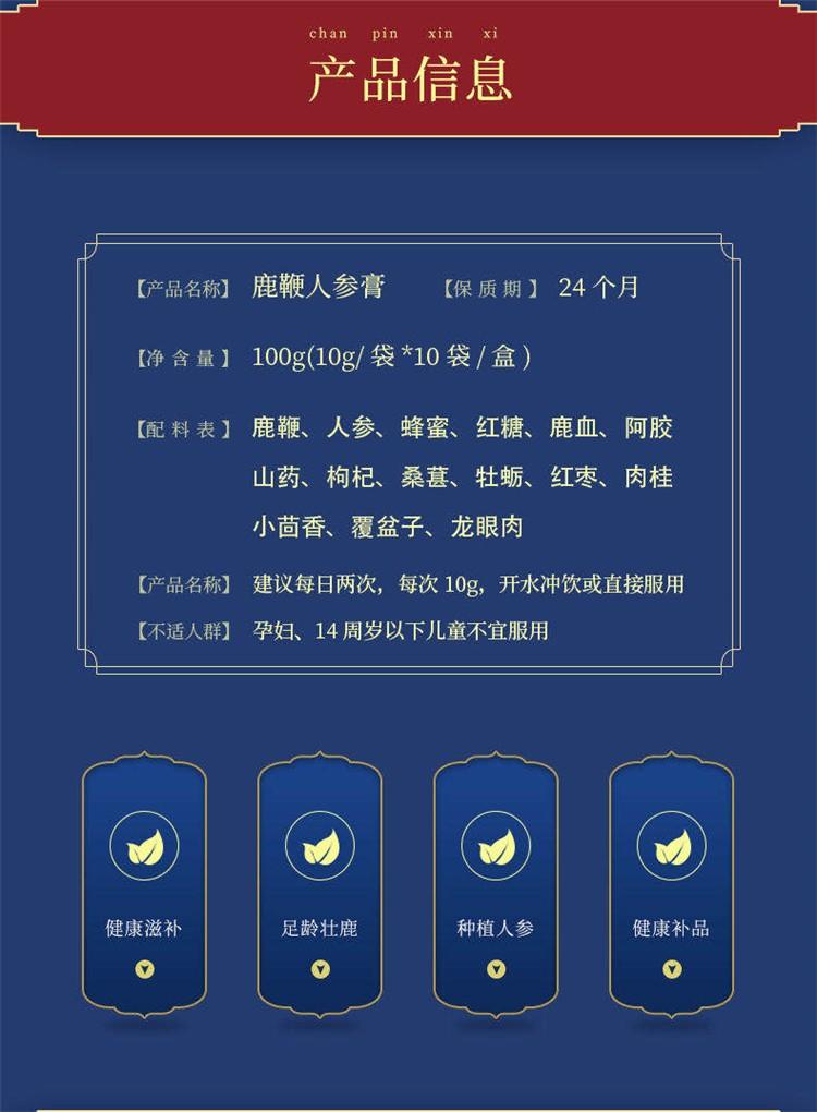 | 产品名称 | 鹿鞭人参膏 | 品牌 | 玉保鹿场 |